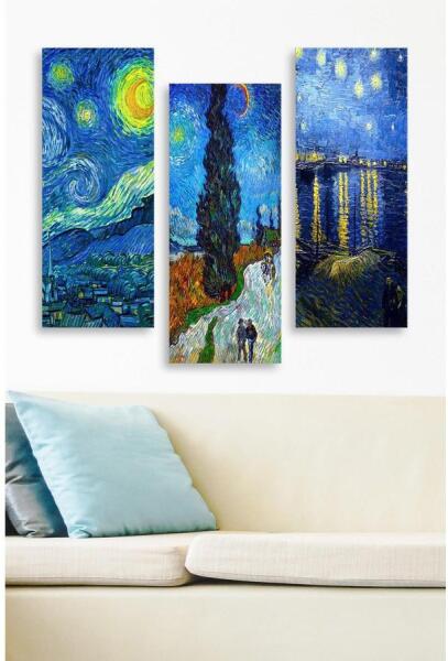 Változtassa át terét Vincent van Gogh remekműveinek magával ragadó szépségével! Merüljön el a művészet világában a gyönyörű dekoratív mdf festményünkkel, amely három lenyűgöző darabot tartalmaz, amelyeket a legendás vincent van gogh ihletett. Minden egyes festményt aprólékosan, kiváló minőségű, 100%-os mdf felhasználásával készítenek, biztosítva a tartósságot és a hosszú élettartamot. Tapasztalja meg van gogh művészetének érzelmi erejét Érezd át a van gogh ecsetvonásai által kiváltott intenzív érzelmeket, miközben ezeket a lenyűgöző festményeket nézegeted. A csillagos éjszaka vibráló színeitől a napraforgók nyugodt szépségéig minden egyes darab megragadja van gogh művészi zsenialitásának lényegét. Hozd létre bármelyik szoba lenyűgöző fókuszpontját Növelje lakóterének, hálószobájának vagy irodájának hangulatát ezzel a három magával ragadó festménnyel. Akassza fel őket együtt triptichonként, vagy helyezze ki őket külön-külön, hogy kifinomultságot és eleganciát kölcsönözzön bármelyik falnak. Változatos méretezéssel szabadjára engedheti kreativitását Mivel mindegyik darab 20 x 50 cm-es, a készlet teljes mérete lenyűgöző 70 x 50 cm. Ez a sokoldalú méretezés lehetővé teszi, hogy ezeket a festményeket könnyedén beilleszthesse bármilyen helyiségbe, legyen az egy hangulatos zug vagy egy tágas galériafal. Technikai részletek: