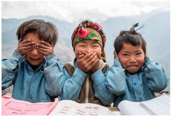 A három majom három fiatal nepáli iskolás művészi fényképe, amely digitális fényképezőgéppel készült.
