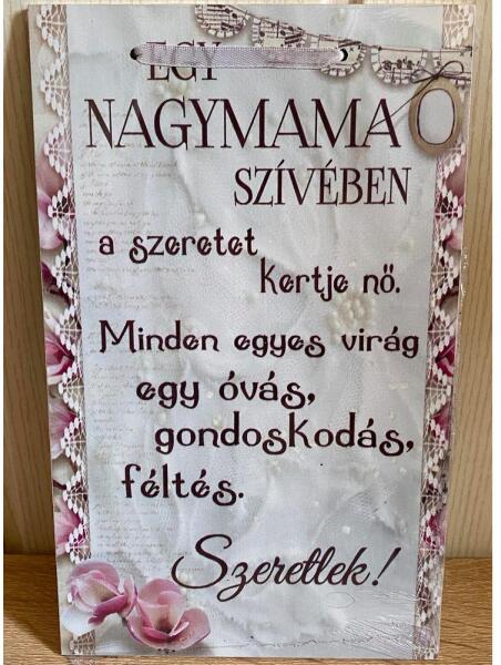 Dísztábla kicsi - Egy nagymama szívMérete: 26 x 16 cm Anyaga: préselt faFelirat: Egy nagymama szívében a szeretet kertje nő. Minden egyes virág egy óvás, gondoskodás, féltés. Szeretlek!