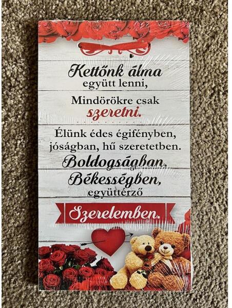 Dísztábla kicsi -  Szerelmes Méret:25,5×14,5x1cm Anyaga: préselt fa Tisztítás: Száraz portalanításFelirat: Kettőnk álma együtt lenni, Mindörökre csak szeretni. Élünk édes égifényben , jóságban, hű szeretetben. Boldogságban, Békességben, együttérző Szerelemben. A dekor táblák kedves feliratai bárkit jókedve derítenek. együtt lenni