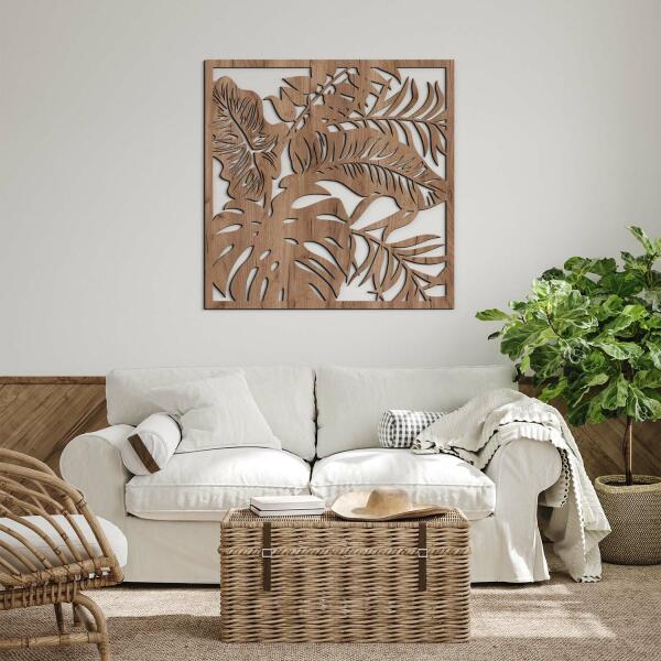 Fa dekorpanel - Növények levelei, gyönyörű természetmotívummal. A képen a monstera levél dominál, amelyet ízlésesen egészítenek ki a pálma- és különböző trópusi levelek. A különböző növények leveleinek képe nagyszerűen illik a nappaliba, előszobába vagy folyosóra. A négyzet alakú kivitel és a finom részletek otthonos melegséget és kellemes megjelenést kölcsönöznek a helyiségnek. Fedezd fel a termék legfőbb előnyeit:
