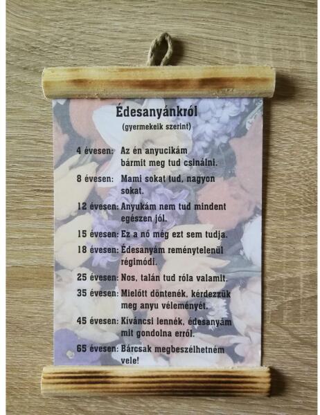 Fa díszes lap - Édesanyánkról Mérete: 16 cm X 11 cm Szöveg: Édesanyánkról(gyermekeik szerint) 4 évesen: Az én anyucikám bármit meg tud csinálni. 8 évesen: Mami sokat tud, nagyon sokat. 12 évesen: Anyukám nem tud mindent egészen jól. 15 évesen: Ez a nő még ezt sem tudja. 18 évesen: Édesanyám reménytelenül régimódi. 25 évesen: Nos, talán tud róla valamit. 35 évesen: Mielőtt döntenék, kérdezzük meg anyu véleményét. 45 évesen: Kíváncsi lennék, édesanyám mit gondolna erről. 65 évesen: Bárcsak megbeszélhetném vele!Mintás, kartonlapra írott szöveg, amelyet, színes fakerettel díszítettünk és bőr akasztóval láttunk el, hogy fel lehessen akasztani. Egy nagyon kedves ajándék Édesanyád számára ez a díszes fa lap. A rajta lévő szavak helyetted beszélnek, mindent elmondanak, amit egy anyának mondani lehet. Ajánljuk születésnapra, névnapra és anyák napjára.