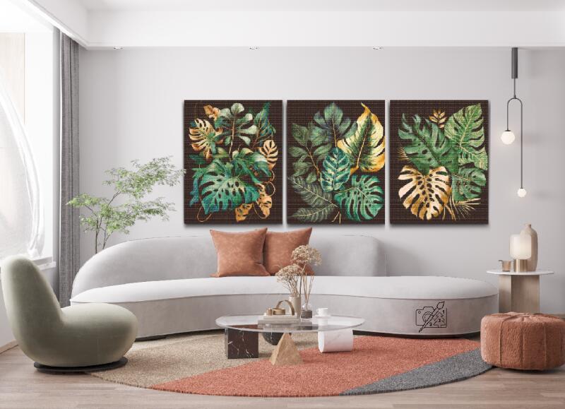 Gyémánt kirakó - Trópusi kúszónövény könnyezőpálma (3 db-os készlet) Méret: 30x40cm (3db), Keretezés: Műanyagtáblával, Gyémántok: Kerek