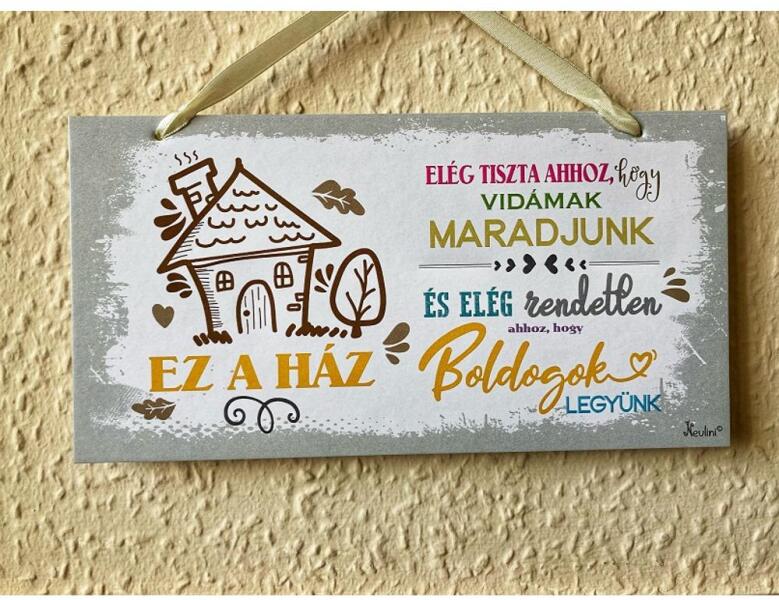 Kicsi dekor tábla - Ez a házMéret: 23 x 12 cm Anyag: 0,2 cm kemény papír Felirat: Ez a ház elég tiszta ahhoz, hogy vidámak maradjunk és elég rendetlen ahhoz, hogy boldogok legyünk!