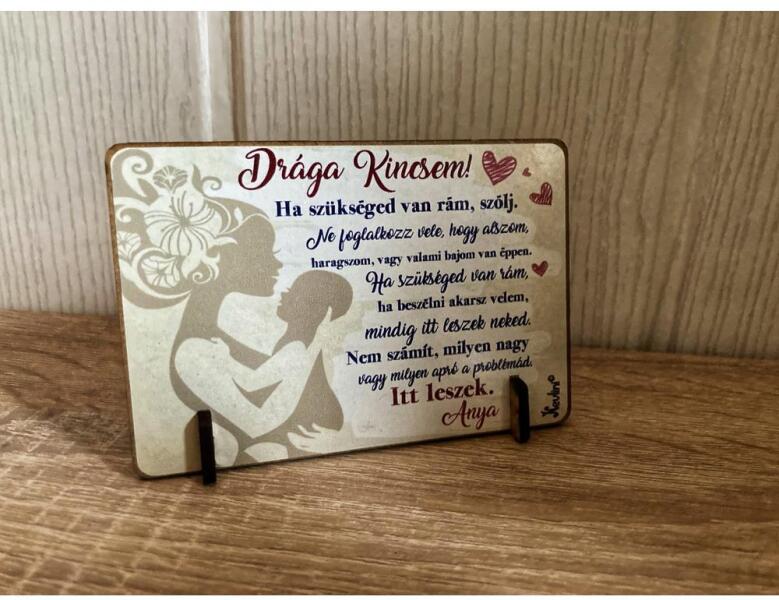 Kis fa tábla - Kis fa tábla - Drága kincsemMéret 11 x 7,5 cm Anyaga: faFelirat: Kis fa tábla - Drága kincsem Ha szükséged van rám, szólj. Ne foglalkozz vele, hogy alszom, haragszom vagy valami bajom van éppen. Ha szükséged van rám, ha beszélni akarsz velem? mindig itt leszek neked. Nem számít, milyen nagy vagy milyen apró a problémád. Itt leszek. Anya