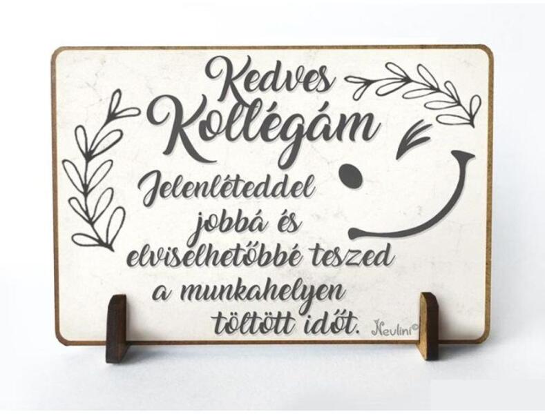Kis fa tábla - Kedves KollégámMéret: 11x7,5cm Anyaga: faFelirat: Kedves Kollégám Jelenléteddel jobbá és elviselhetőbbé teszed a munkahelyen töltött időt. Kedvenc kollégádnak keresel valami kis ajándékot, de nem tudod mivel lepd meg? Válaszd ez a kis feliratos táblát, ami helyetted beszél. Elmondja, hogy mennyivel könnyebb minden nap, mikor együtt dolgoztok. Ajándékozd meg vele születésnapjára vagy névnapjára. Biztosan örülni fog neki.
