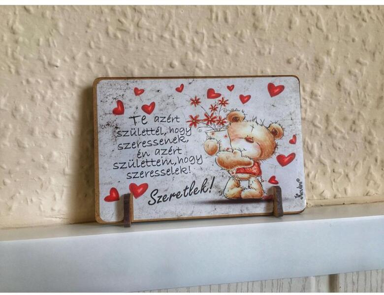 Kis fa tábla - Te azért születtél . . Méret 11x7,5cm Anyaga: fa Tisztítás: száraz portalanításFelirat: Te azért születtél, hogy szeressenek, én azért születtem, hogy szeresselek!  Szeretlek!Ha szeretnéd kedvesedet meglepni valamivel, amivel kifejezheted neki mennyire szereted, akkor ez a kis tábla nagyon jó választás lesz. Aranyos képek és kedves szavak. Ezzel biztosan belopod a szívébe magad és ha bármikor ránéz, Te jutsz majd eszébe róla. Ajánljuk Szerelmednek születésnapjára, névnapjára, a szerelmesek napjára vagy csak ha szeretnéd neki még jobban kifejezni, amit iránta érzel.